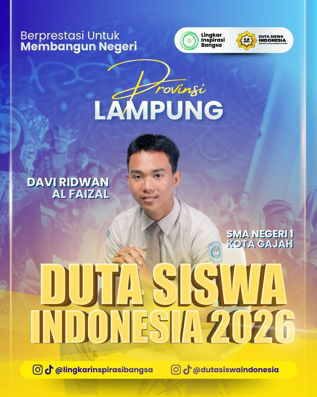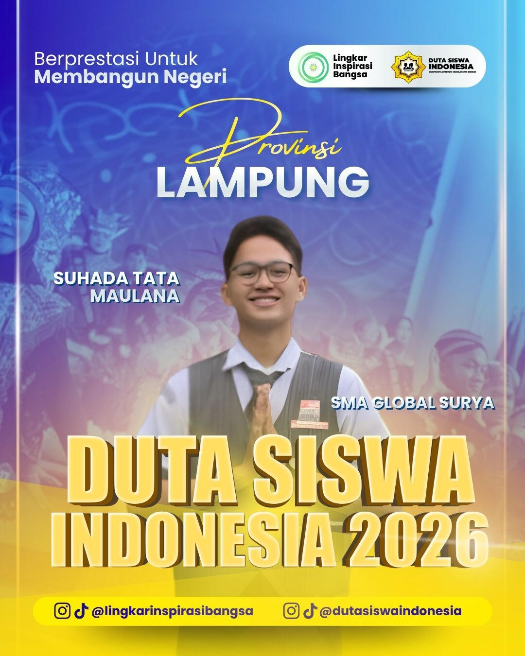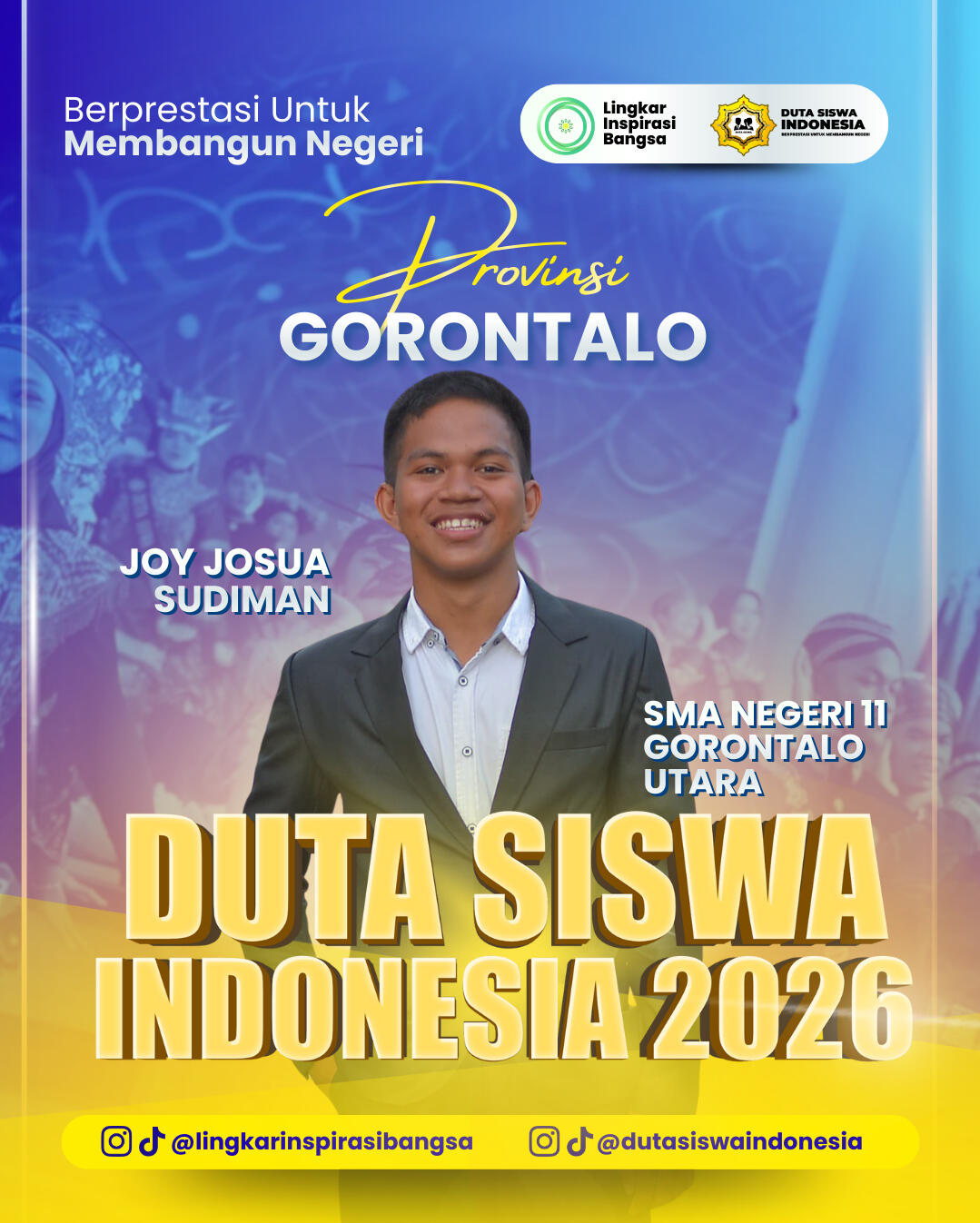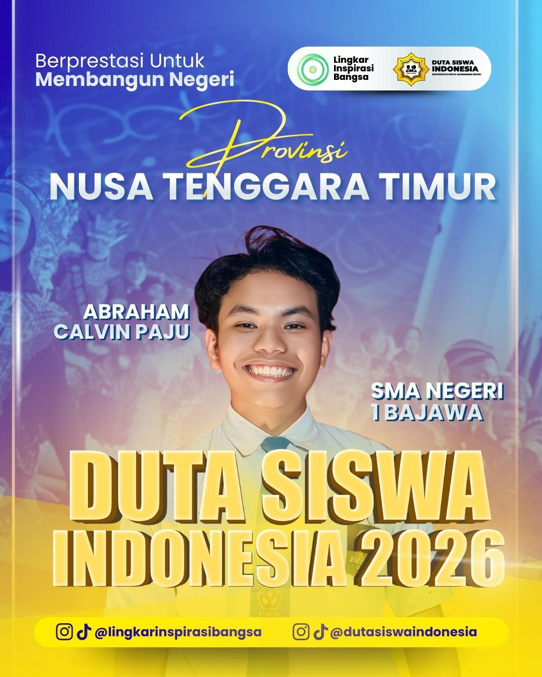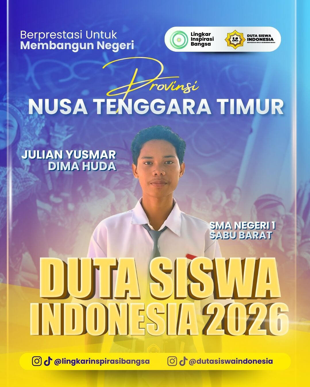 Selamat dan apresiasi setinggi-tingginya kepada para Grand Finalis Duta Siswa Indonesia 2026! Perjuangan kalian hingga tahap ini adalah bukti nyata dari ketekunan, keberanian, dan semangat untuk berkontribusi melalui inovasi digital. Terima kasih telah menjadi bagian dari perjalanan inspiratif ini. Mari rayakan pencapaian luar biasa ini dan bersiaplah menorehkan prestasi lebih tinggi di babak grand final!