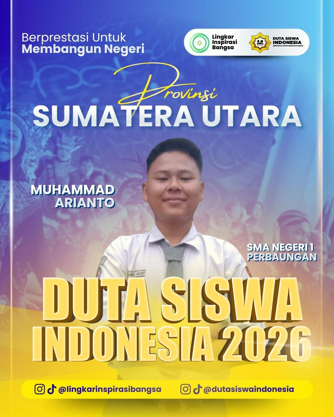 Duta Siswa Indonesia merupakan wadah bagi seluruh siswa-siswi di Indonesia untuk mampu meraih prestasi di tingkat nasional maupun internasional. Program-progam yang akan kami rancang dan laksanakan bersama seluruh duta siswa diharapkan dapat memberikan semangat dan dampak positif pada lingkungan belajar informal siswa. Program-program akan kami fokuskan pada hal-hal yang berhubungan dengan pendidikan, penelitian dan pengabdian sehingga nantinya selain dapat meningkatkan kemampuan akademis dan non akademis siswa, juga dapat meningkatkan kepedulian siswa terhadap masyarakat sekitar. Pengembangan Bakat dan kreatifitas juga akan menjadi hal yang sangat kami perhatikan dalam membangun siswa-siswi yang kreatif, tekun dan memiliki semangat belajar tinggi. Harapan kami dengan terlaksananya Duta Siswa Indonesia dapat menjadikan salah satu sumber terciptanya generasi-generasi terbaik untuk Indonesia - Anggita Ulan Nasution, M.Pd